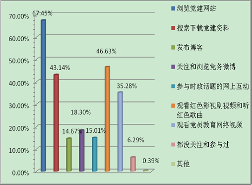 二是党的声音在互联网上仍然偏弱。党组织、党员的声音在互联网上整体上微弱、滞后、被动。尤其在一些影响力较大的商业网站上党的声音更少,很少看到党员教育的内容。问卷调查显示,有52.37%的党员选择有些党组织没有运用新兴媒体开展工作,占第1位(见图3);只有8.38%的省、市、县组织部门开办了“党务微博”(见图4);在互联网上“发布博客”、“关注和浏览党务微博”、“参与时政话题的网上互动”的党员分别只有14.67%、18.3%、15.01%(见图5)。