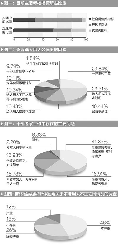 执行选人用人标准出现偏差。调研中不少干部群众反映,当前选人用人标准和条件是明确的,但在执行过程中有时会出现偏差。一是简单化问题。一些地方和部门在执行干部选拔任用标准时过于僵化,不考虑职业特点和岗位要求,对不同类型、不同层次干部适用同一标准。二是选择性问题。干部选拔任用标准多是原则性要求,一些地方和部门在把握和执行标准时做选择、搞变通,按需取用,符合自己思路时就强调选人用人要“坚持标准”,不符合自己思路时就强调选人用人要“不拘一格”。三是片面化问题。有的地方和部门没有全面准确贯彻“德才兼备”选人用人标准,一定程度上还存在唯票、唯分、唯GDP、唯年龄等问题。据浙江省台州市委组织部课题组调查,干部标准在考核评价实际工作中落实仍然不够全面,经济实力或经济类指标实际上约占60%—70%比重(见图一)。