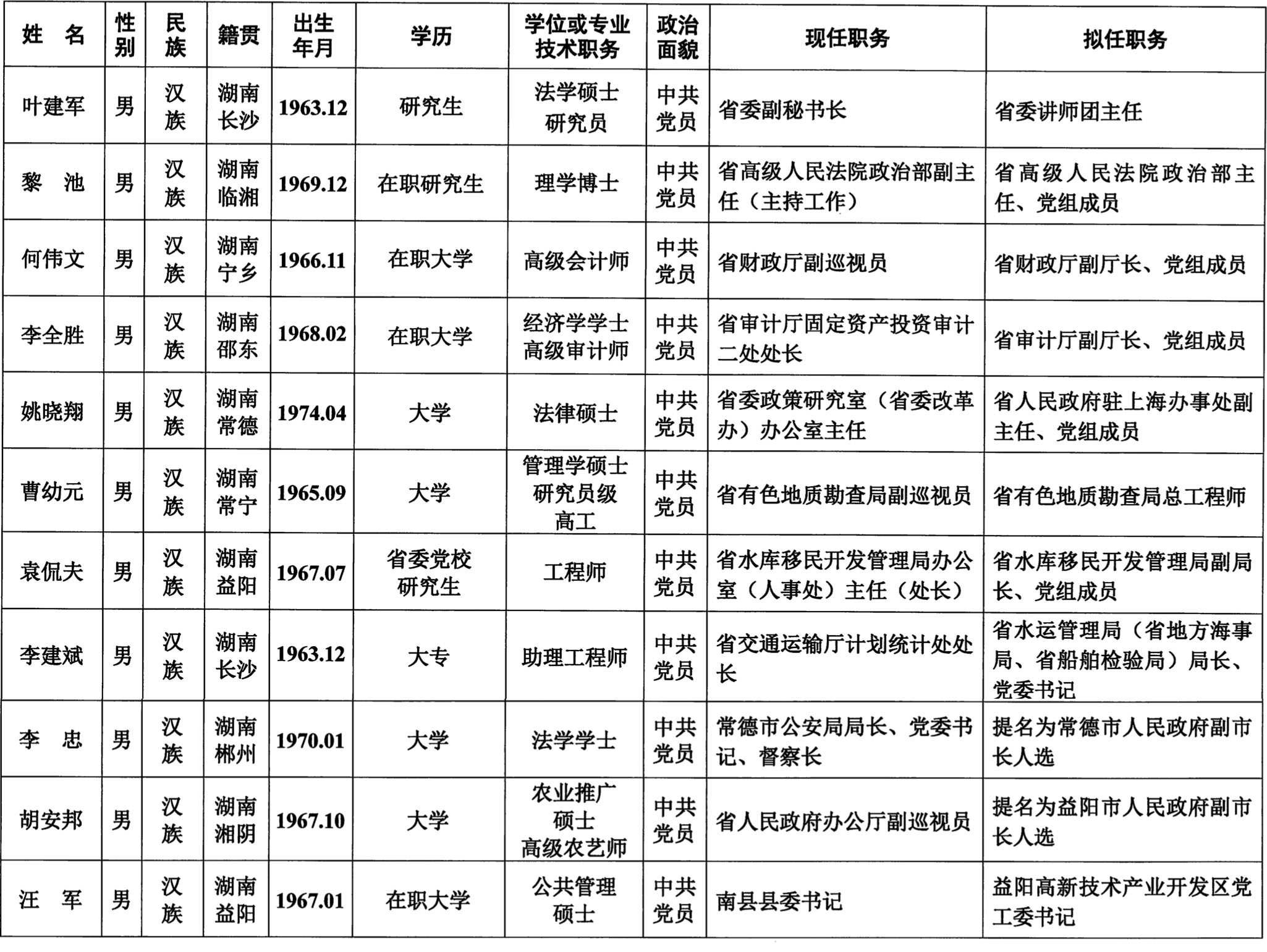 湖南省委管理干部任前公示
